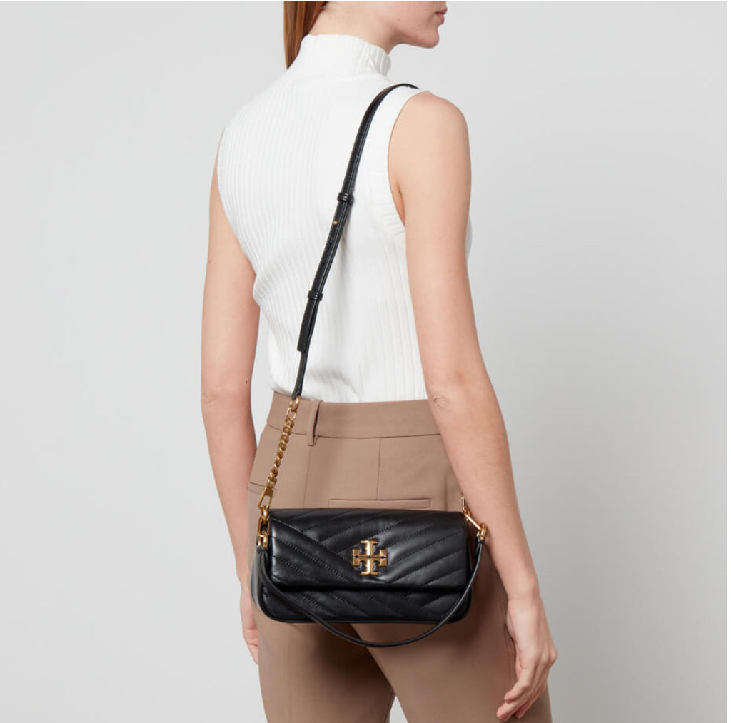 Tory Burch's 'Double T' hardware adds a touch of elegance to the petite Kira shoulder bag with its distinctive beveled design. Expertly crafted from smooth black leather, the bag features all-over chevron quilting and is complete with gold-tone chain inserts to elevate this classic silhouette to new heights.