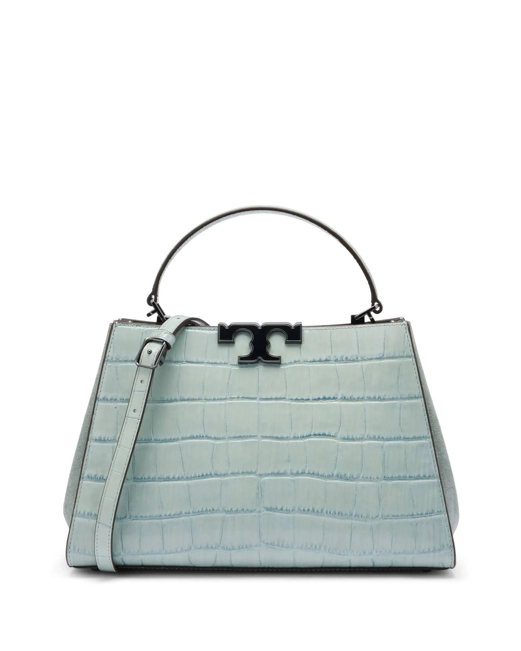 A bold logo medallion makes a statement on a croc-embossed leather satchel furnished with an adjustable, removable crossbody strap for optional carry.